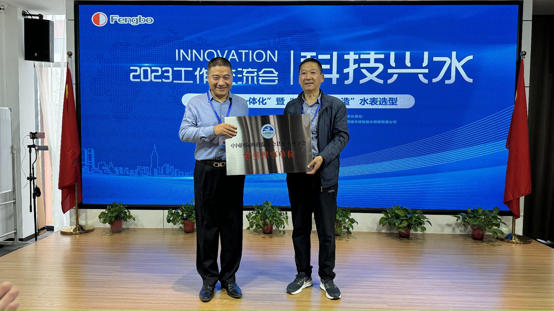 縣鎮水務分會秘書長郭進奎代表縣鎮水務分會向豐博計量集團董事長楊德柱授牌—“縣鎮水務分會常務理事單位”。